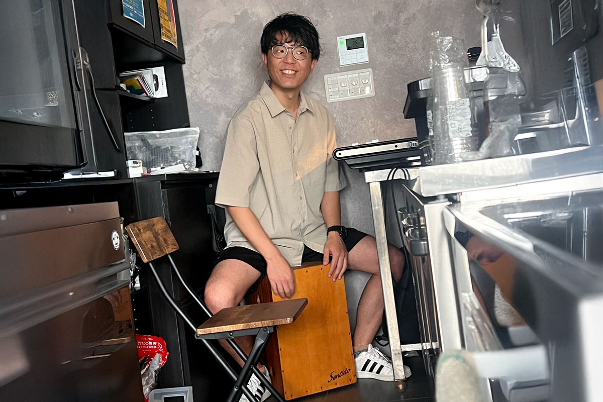 TAD BOXの店長・村田さんはPAもやりつつカホンを叩きサポート! ハマダさんと村田さんとの付き合いは10年を超え2桁クラス。