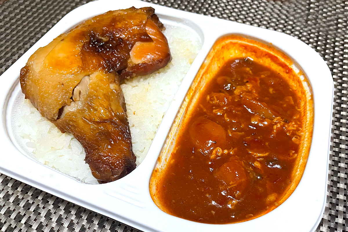 今回筆者がいただくのは「リュウジのグヤーシュ ライス付(ローストチキン)」。蓋を開ける前から漂ってきてはいたが、開けるなりグワっとスパイスとトマトの香りが広がり食欲をそそる。いやしかし待ってくれ。肝心の「グヤーシュ」の前に、ローストチキンがデカくないですか!? クリスマスかと思ったわ!! 筆者の手のひらくらいのサイズがあるぞ。