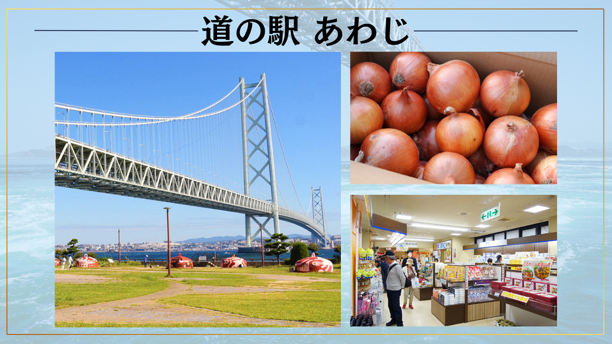 ツアー行程の最後は「道の駅 あわじ」。明石海峡大橋を真下から見上げる大迫力の絶景スポットであり、館内には自社工場直送の特産品や限定のお土産が豊富に揃っているので、お土産の購入もバッチリ!! 海産物もさることながら、淡路牛、加えて淡路島と言えばの名産、タマネギを使った商品などを取り扱っており、鳴門・淡路島の旅の締めくくりとしてピッタリ。「道の駅 あわじ」で、この地ならではの逸品を手に取って欲しい。筆者個人的には「大江のり」がオススメ! 贈答品としても喜ばれるぞ!